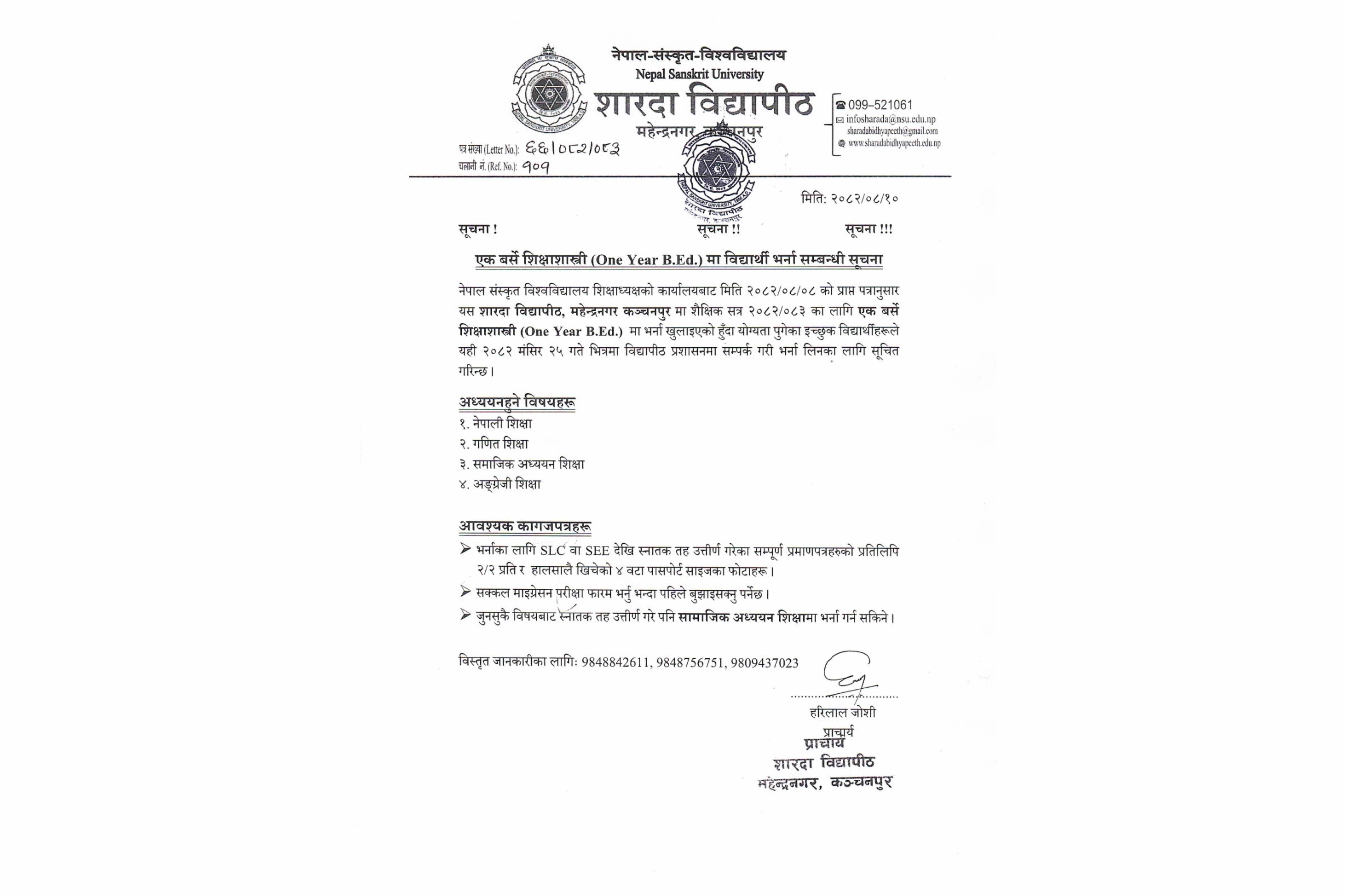Published on : Nov 28, 2025 एक बर्से शिक्षाशास्त्री (One Year B.Ed.) मा विद्यार्थी भर्ना सम्बन्धी सूचना ।